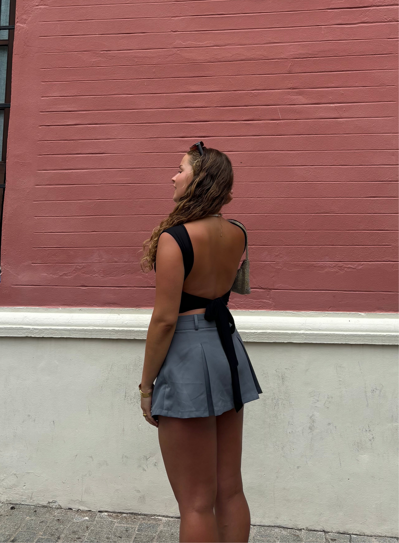 Introducing the Backless Bow Top perfect for any occasion. Show off a little skin with its backless design and back tie straps that create a beautiful bow. Made from stretchy and comfortable fabric, this top is double layered in white for added coverage. Stay stylish and comfortable with this must-have piece.