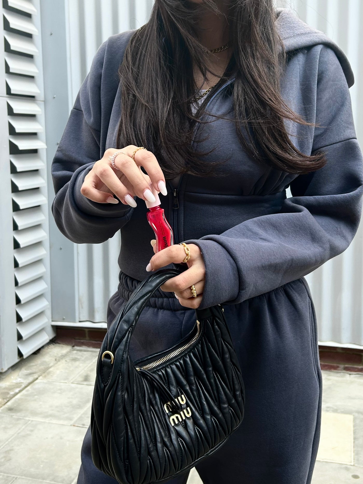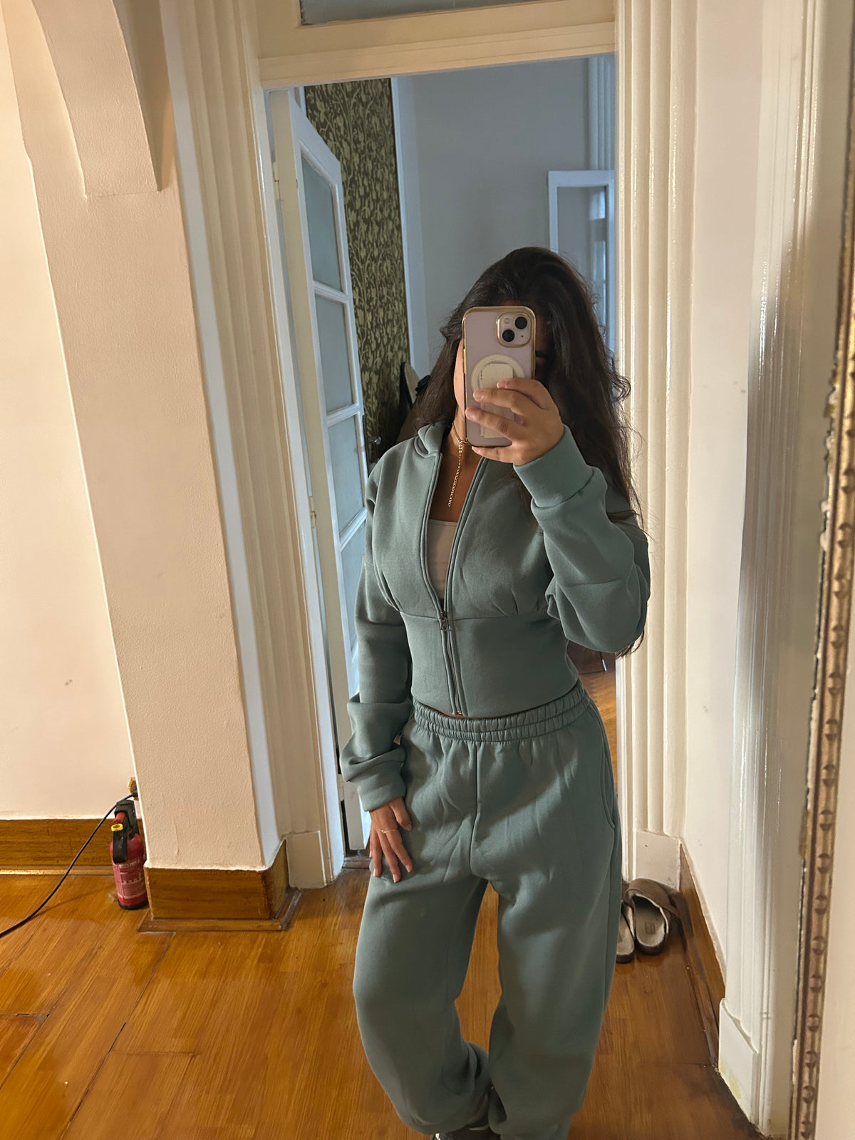 Stay warm and stylish with the Cozy Set, made from soft, durable Melton material. Featuring a zip-up jacket and high-waisted joggers with an elastic waistband, it’s perfect for lounging or casual outings.